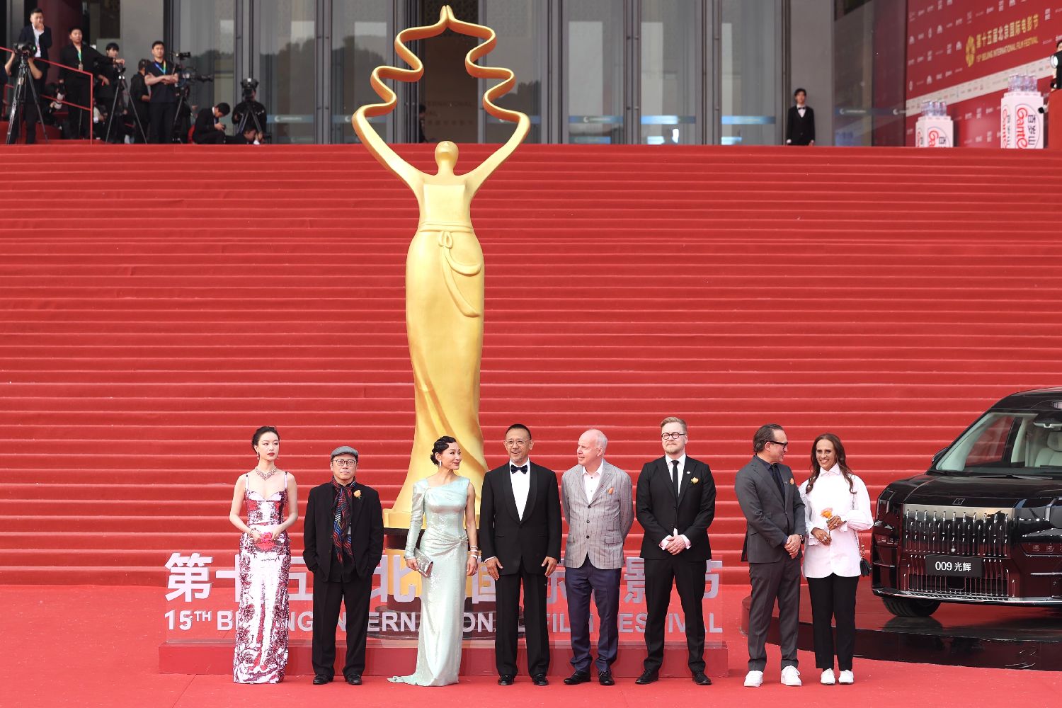 2025年4月26日,第十五届北京国际电影节闭幕红毯仪式在北京雁栖湖国际会展中心举行。“天坛奖”国际评奖委员会成员在“天坛女神”前合影。(图片来源:中新社)