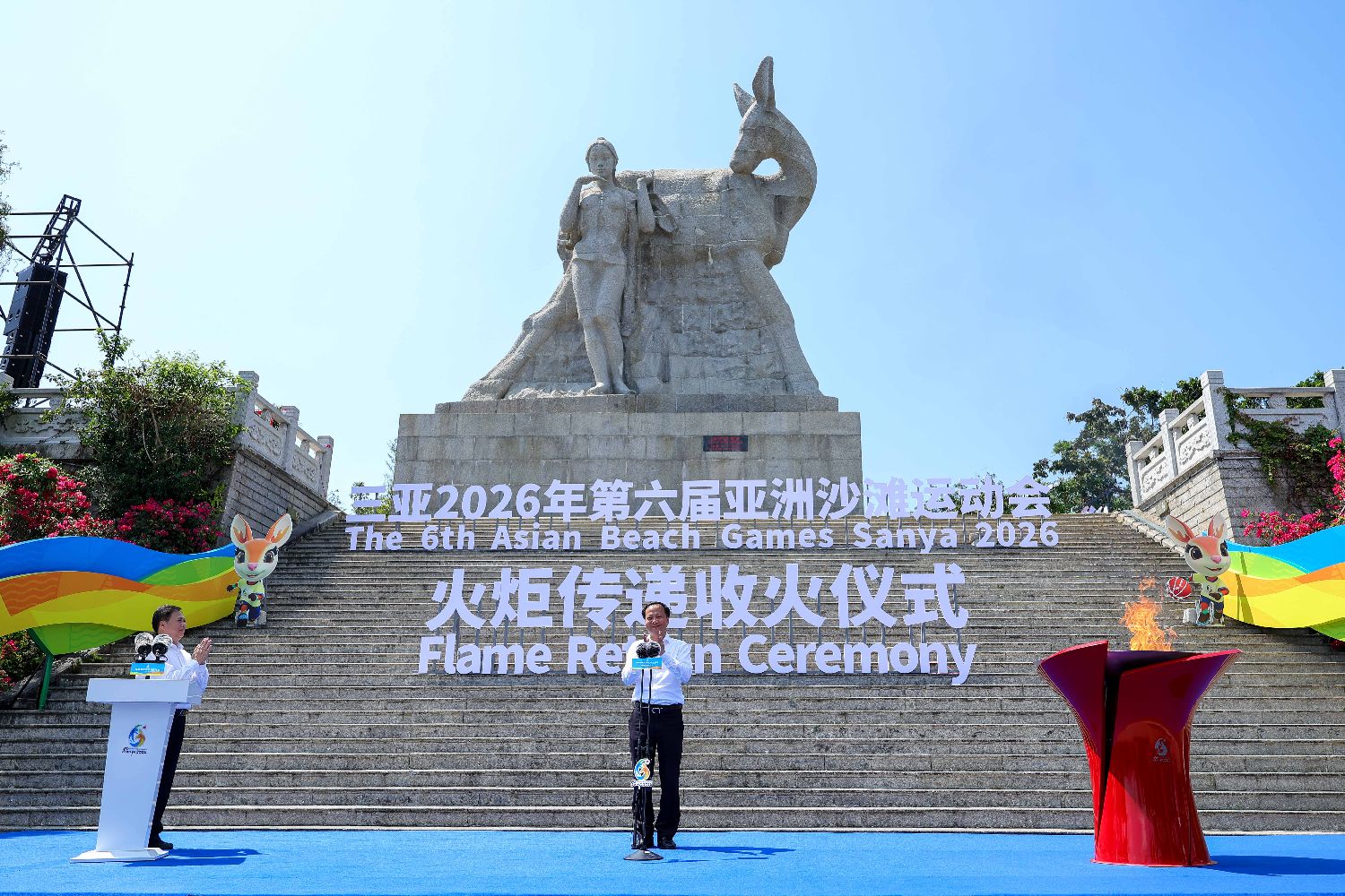 3月30日,第六届亚洲沙滩运动会火炬传递活动在海南三亚举行。本次传递以“传递友谊相约三亚”为主题,设置火种采集、起跑仪式与收火仪式三个核心环节。74名火炬手接力奔跑,串联起约10.5公里的三亚湾沿线景观,共同呈现了一场融自然风光、城市活力与体育激情于一体的预热盛典。图为火炬传递收火仪式在鹿回头风景区举行。(中新社)