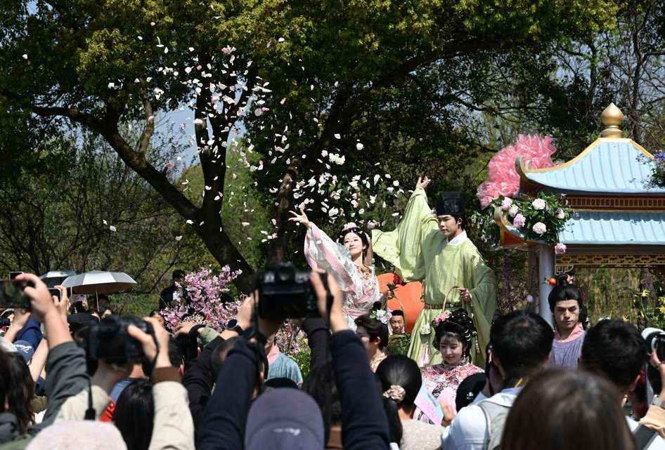 3月29日,2026年西溪花朝活动在浙江杭州西溪国家湿地公园开幕,105种花卉、近8万盆花株在湿地开放,“十二花神”和汉服“同袍”在湿地巡游,兼具观赏性和文化性的沉浸式宋韵春日盛会吸引游人。图为游人观看花车巡游。