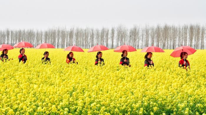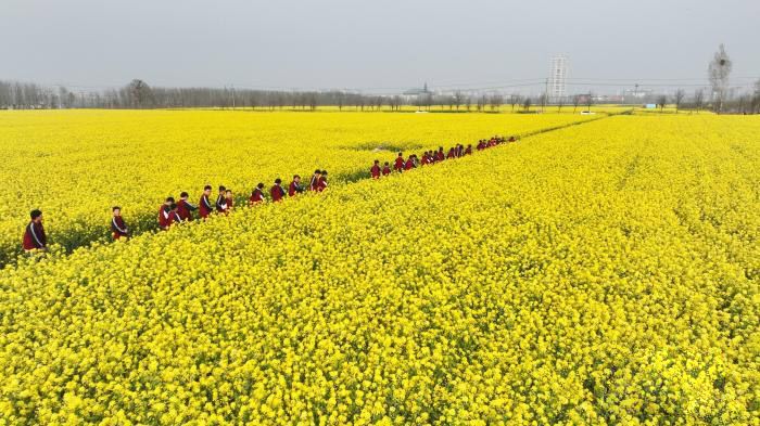4月1日,航拍河北省邯郸市广平县万亩油菜花盛放,金黄花海连绵成片,吸引不少游客前来踏青赏花、亲近自然,尽享春日美好时光。图为小学生们踏青赏花。(中新网)