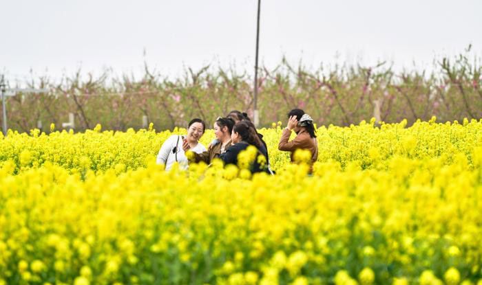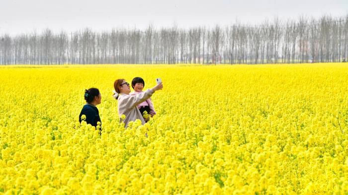 图为游客在油菜花海中拍照、赏花。(中新网)
