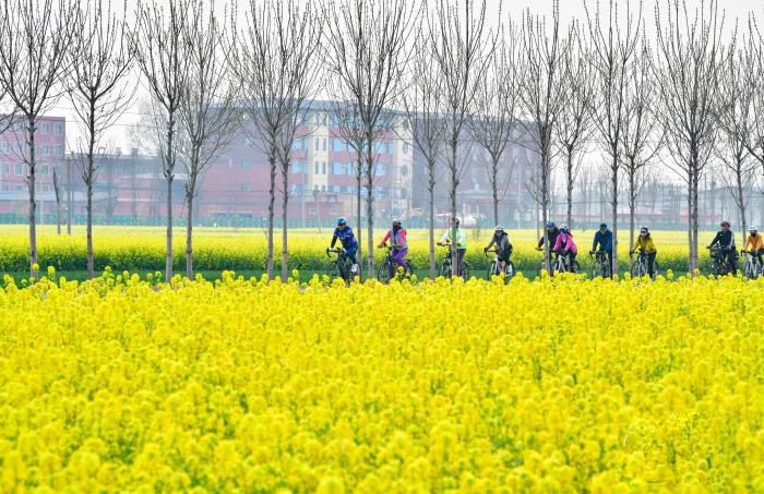 图为骑行爱好者在油菜花海中穿行。(中新网)