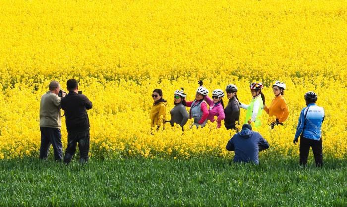 图为骑行爱好者在油菜花海中留影。(中新网)