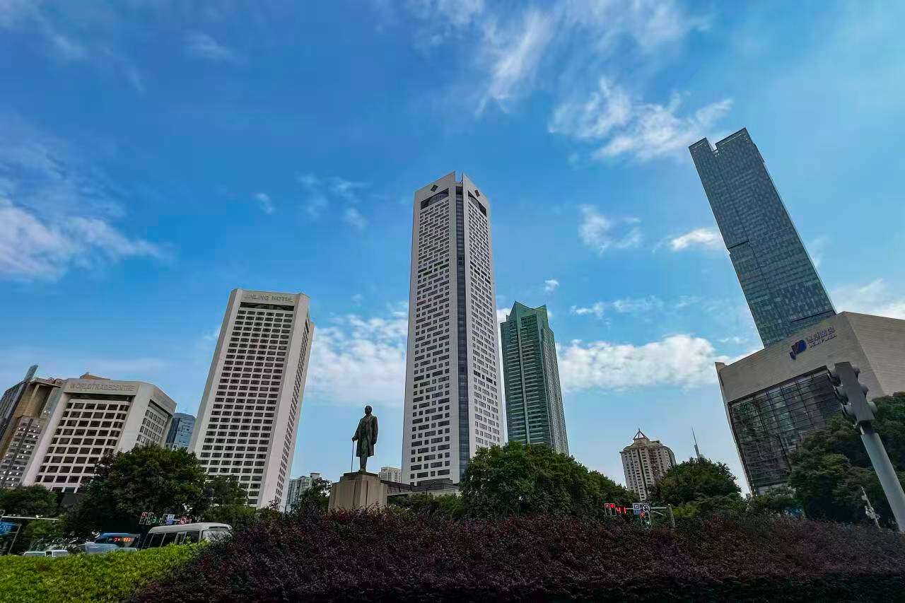 南京新街口孙中山铜像与现代化高楼。