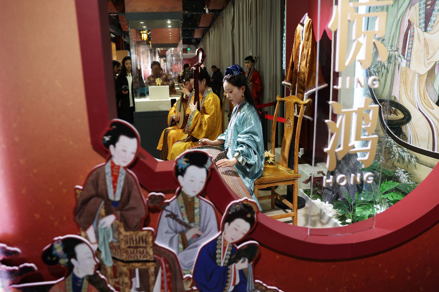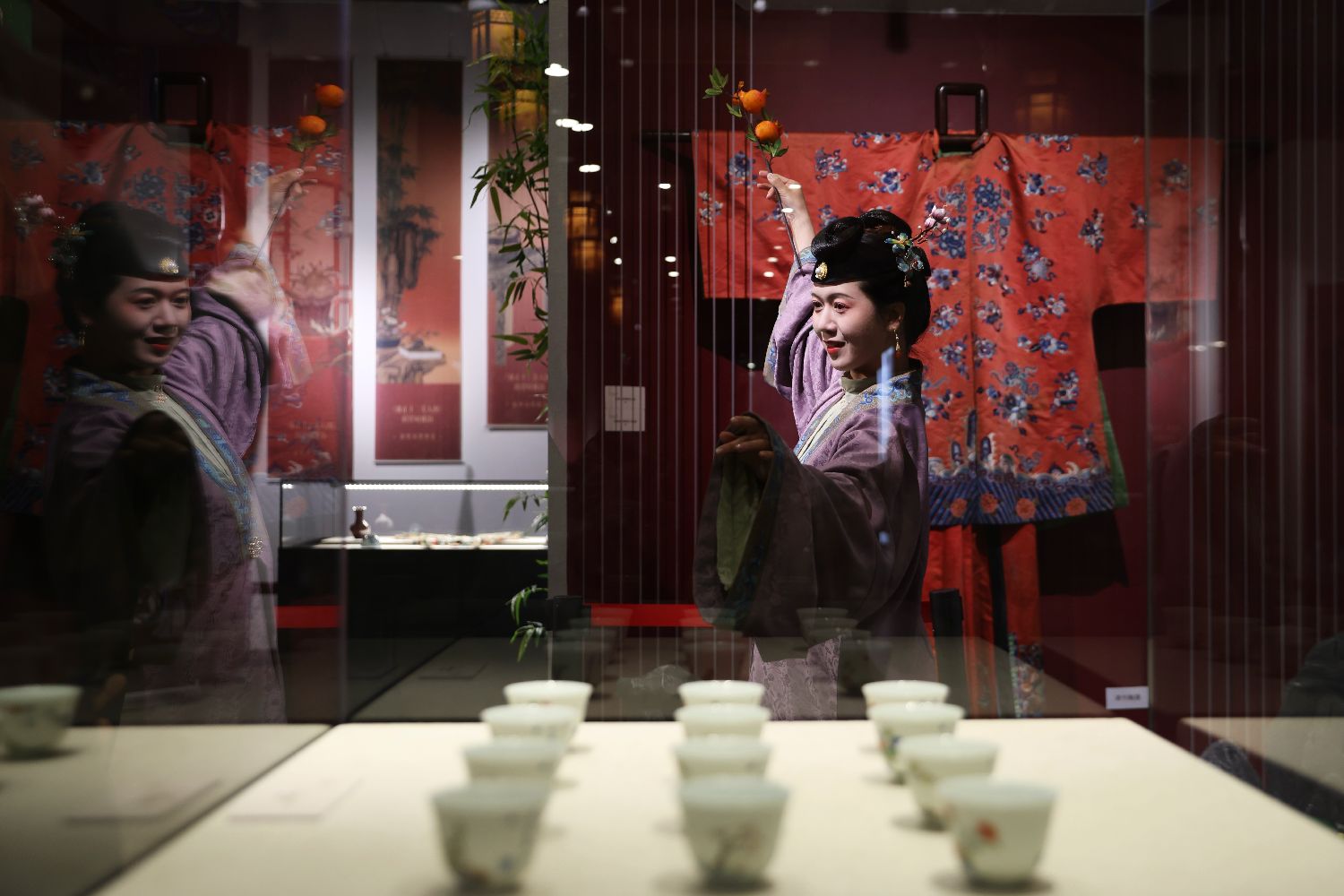 4月9日,“美人”在北京圆明园内“屏影惊鸿——雍正十二美人图岁时雅韵展”现场表演。(中新社)