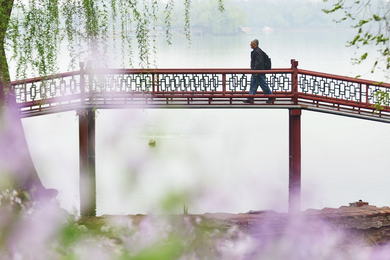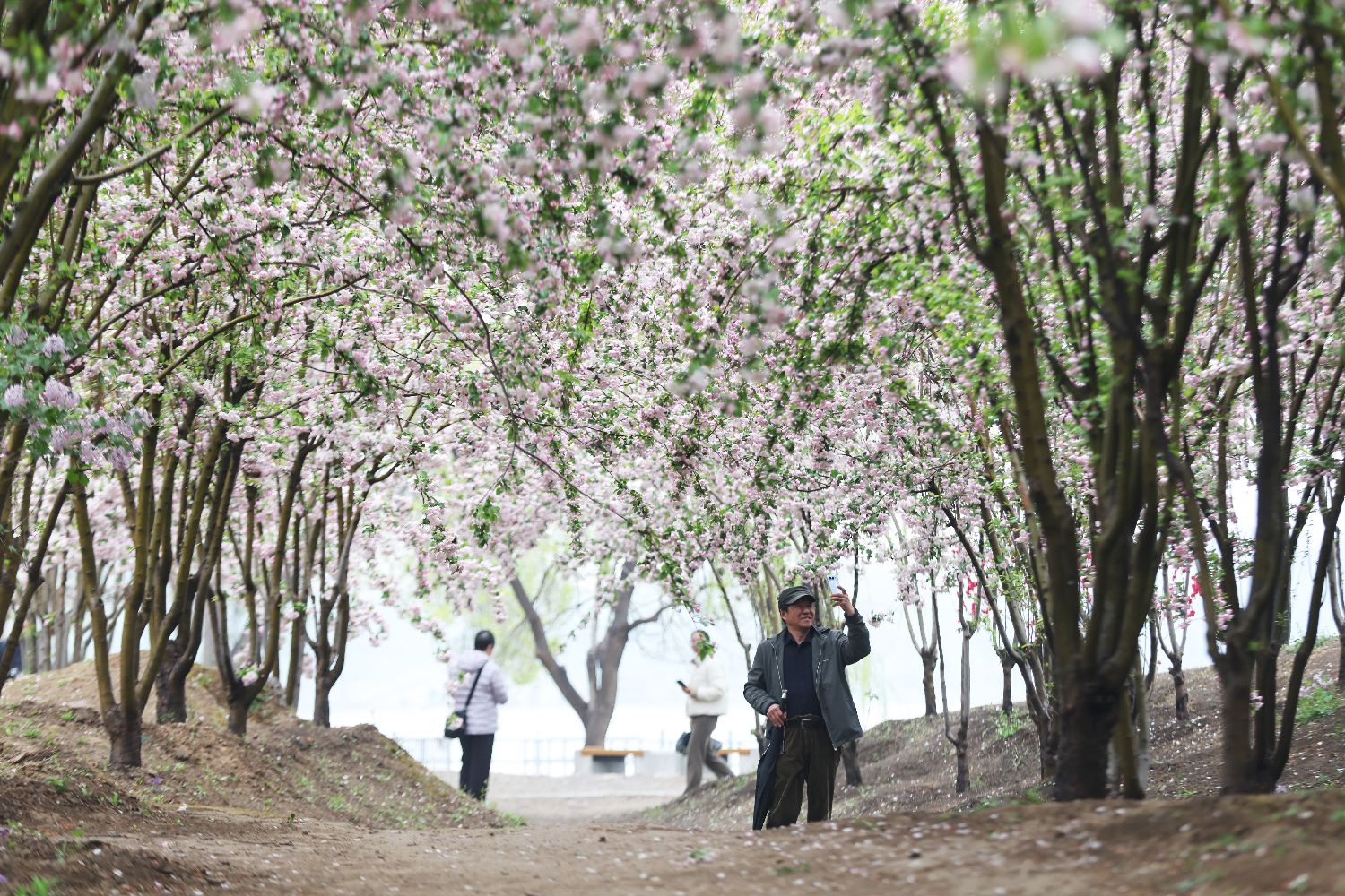 4月9日,游客在北京圆明园内踏青游玩。(中新社)