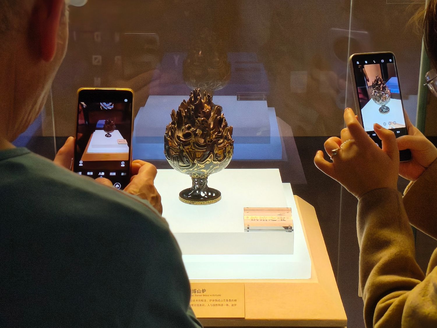 4月11日,游客在河北博物院欣赏错金铜博山炉。