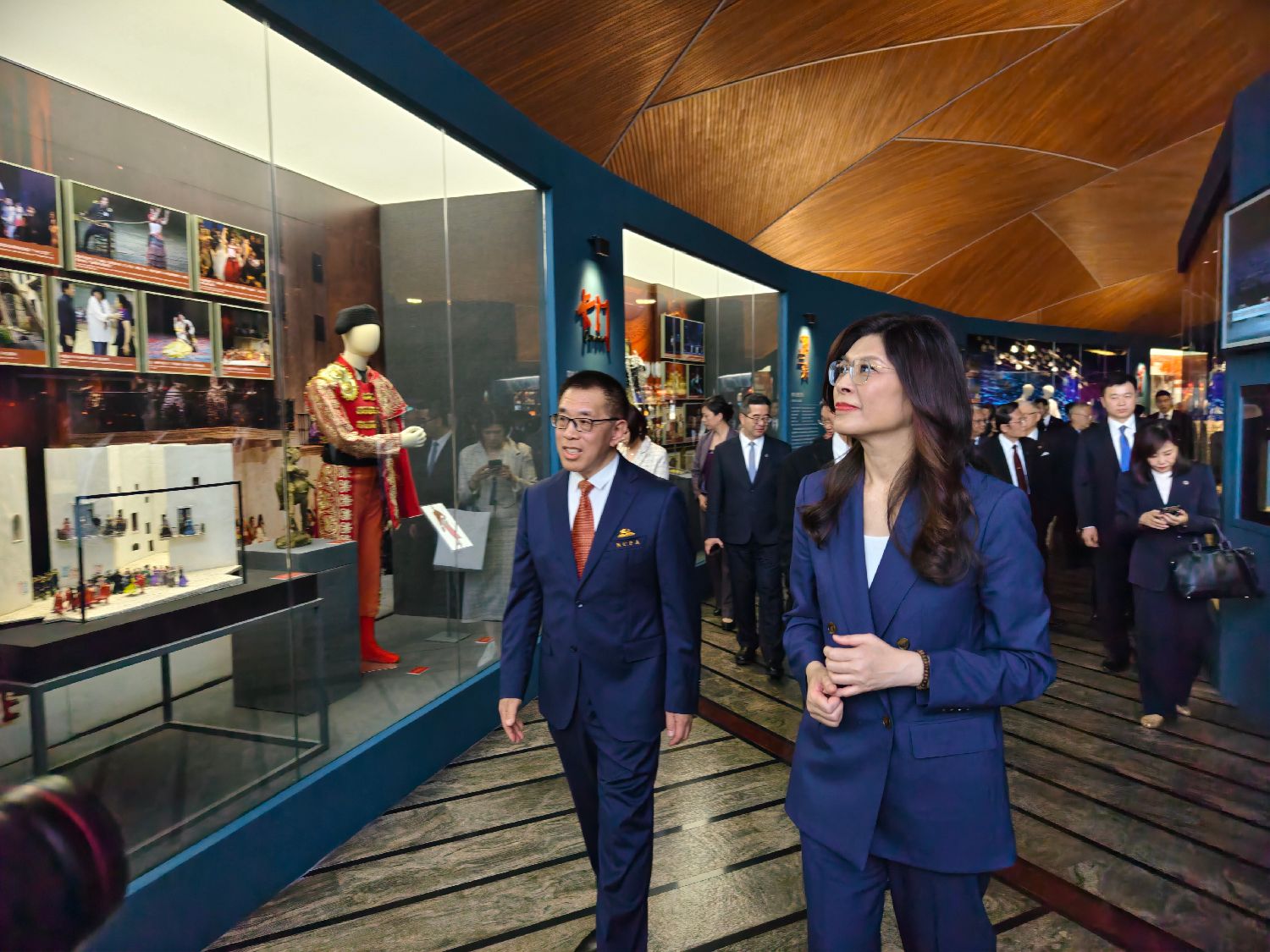 北京时间4月10日下午,中国国民党主席郑丽文(右)一行,在院长王宁(左)陪同下,参观国家大剧院。(图片来源:中新社)
