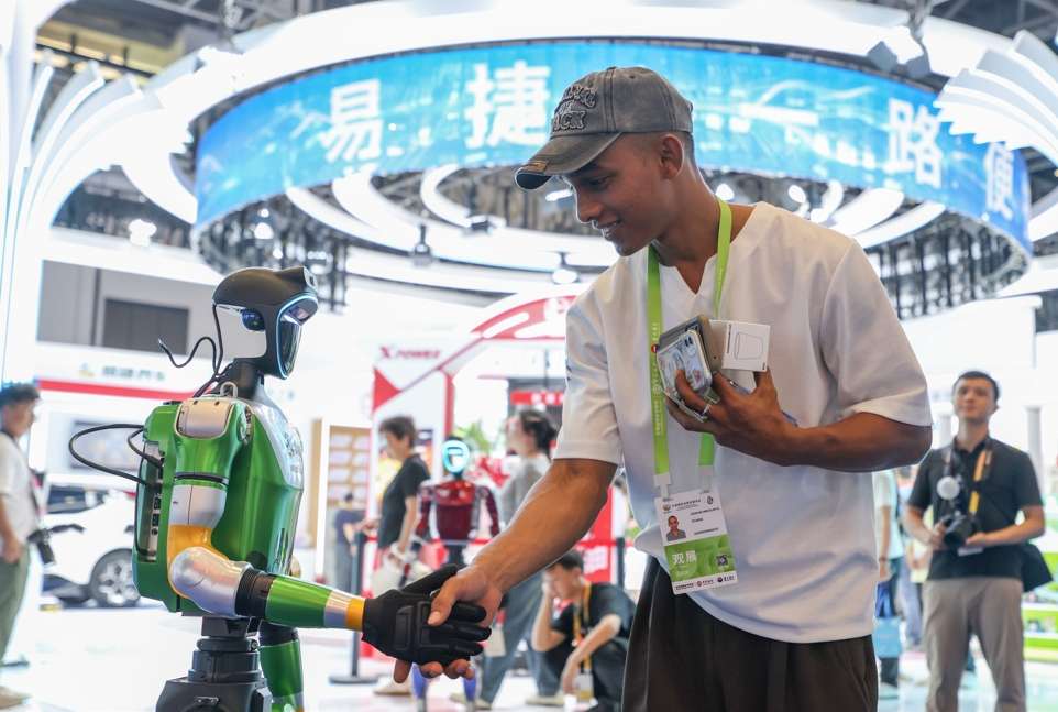 4月14日,第六届中国国际消费品博览会正在海南海口举办。图为来自孟加拉国的参观者和机器人握手。