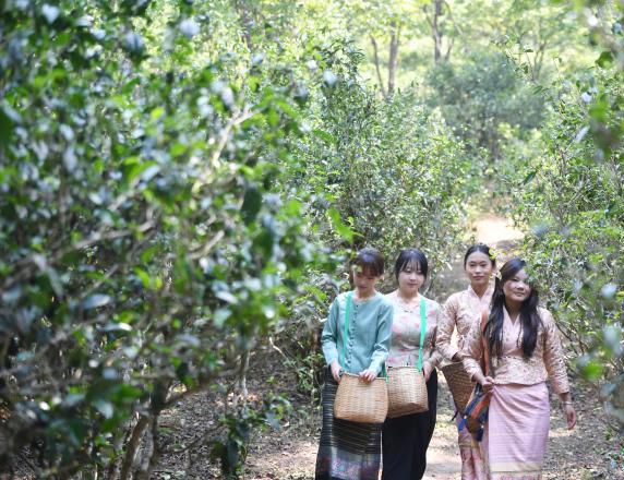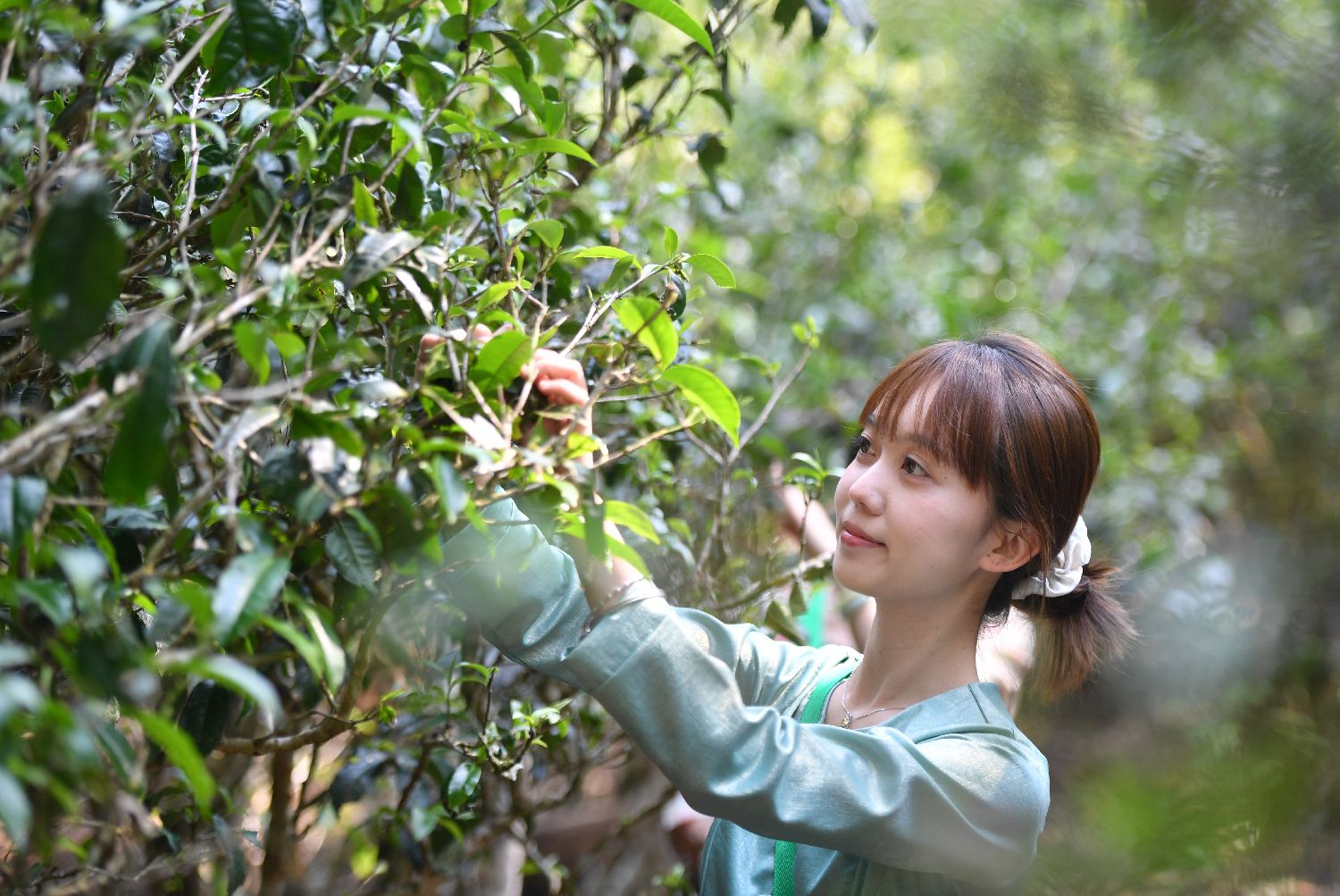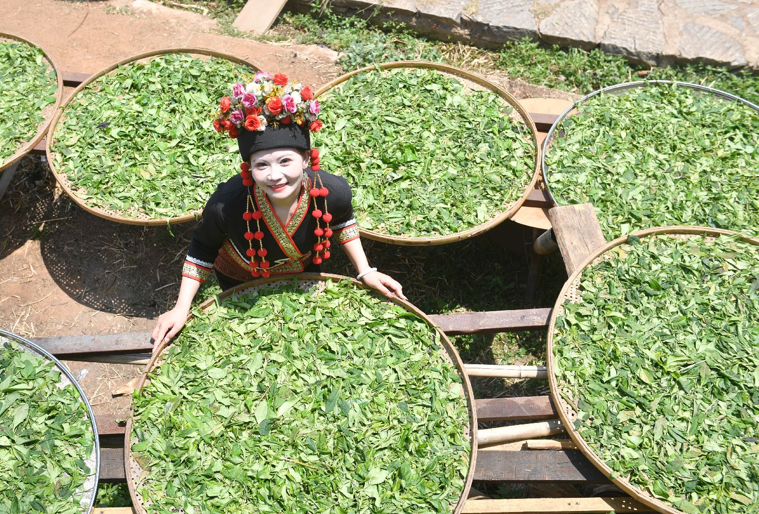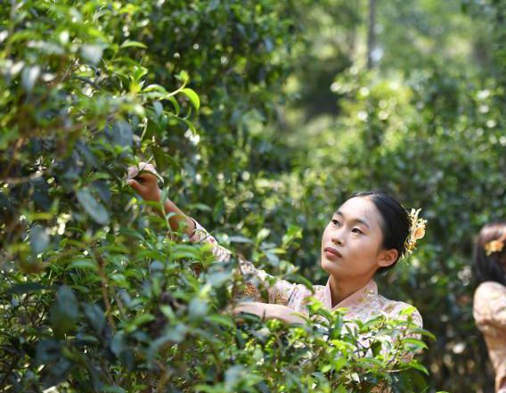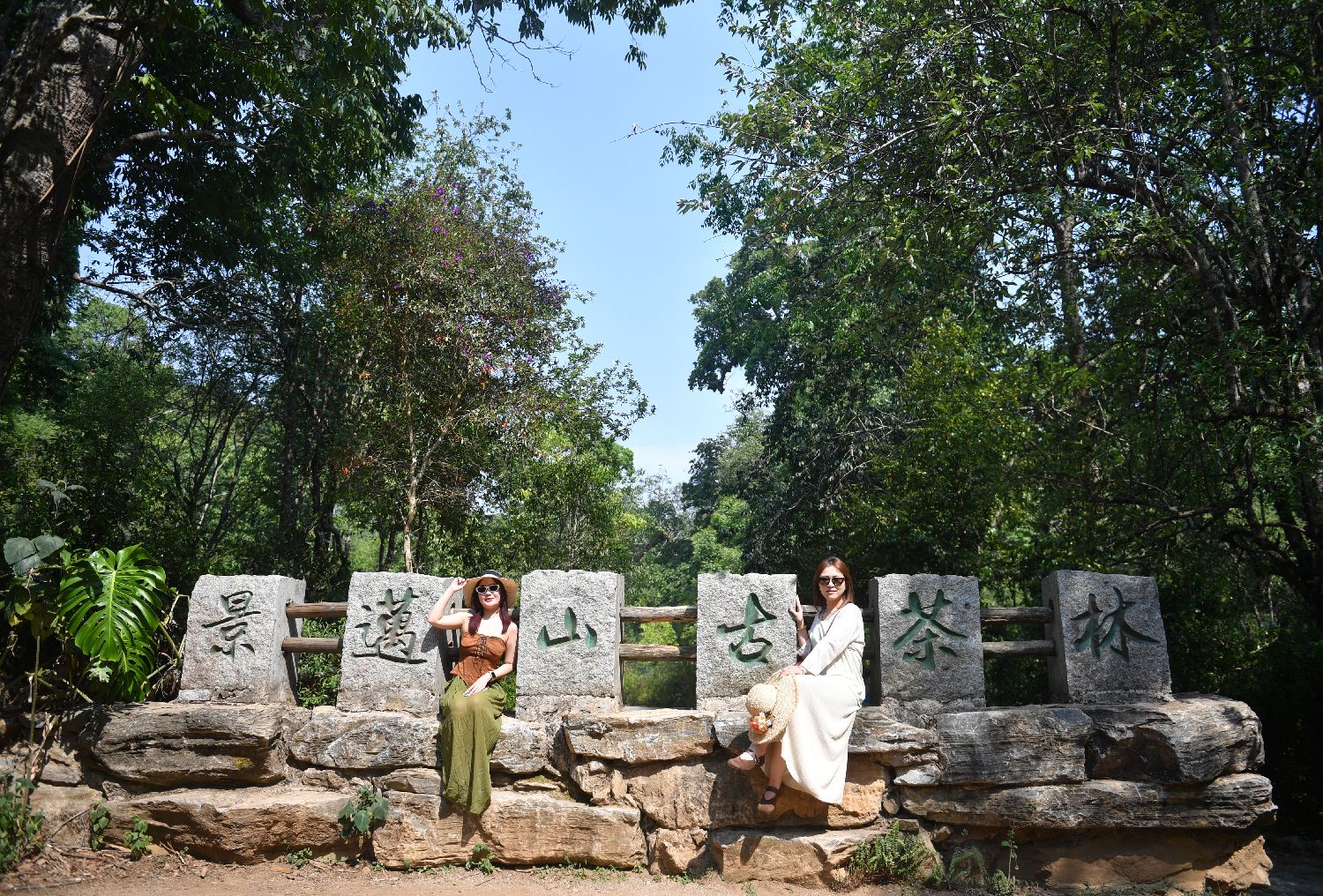 4月14日,游客身着布朗族服装拍照。近日,地处云南省普洱市澜沧拉祜族自治县的景迈山千年万亩古茶园进入采收季,吸引游人前来买茶、观光。2023年9月17日,“普洱景迈山古茶林文化景观”列入《世界遗产名录》。(中新社)