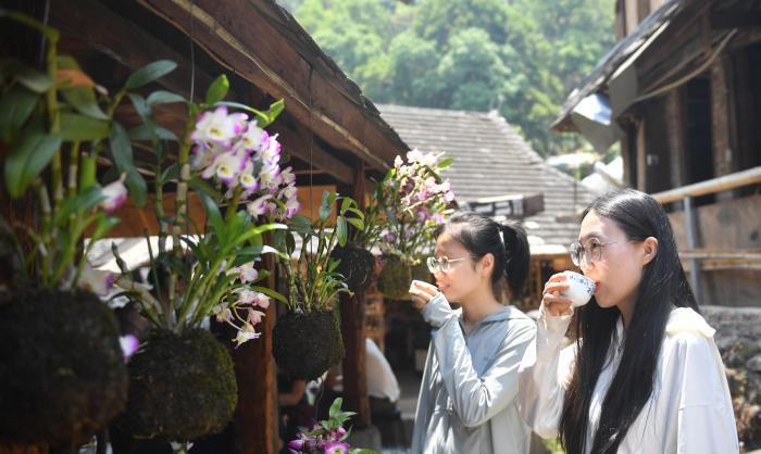 4月14日,两名游客在景迈山糯干古寨品茶赏花。(中新社)