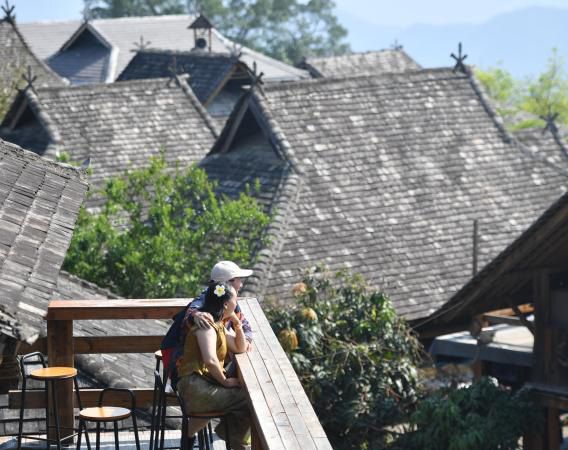 4月14日,两名游客在景迈山翁基古寨赏景。(中新社)
