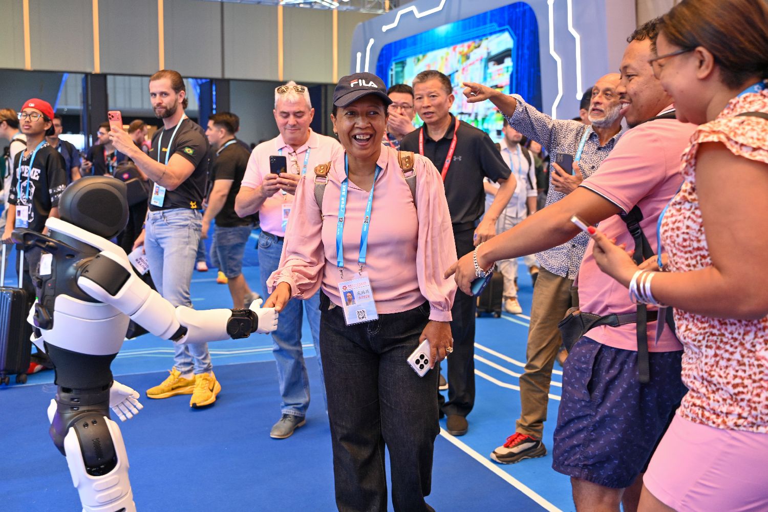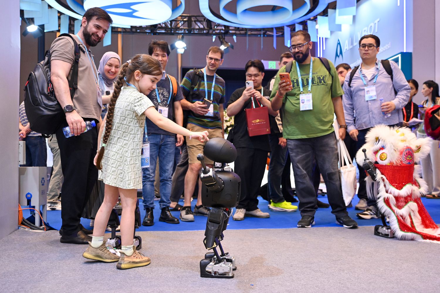 4月15日,第139届中国进出口商品交易会(广交会)第一期在广东广州开幕迎客。本届广交会特设4200平方米的服务机器人专区,汇聚46家行业优质企业,集中呈现中国服务机器人领域的技术创新与全场景应用能力。图为一款人形机器人与境外采购商互动。(中新社)