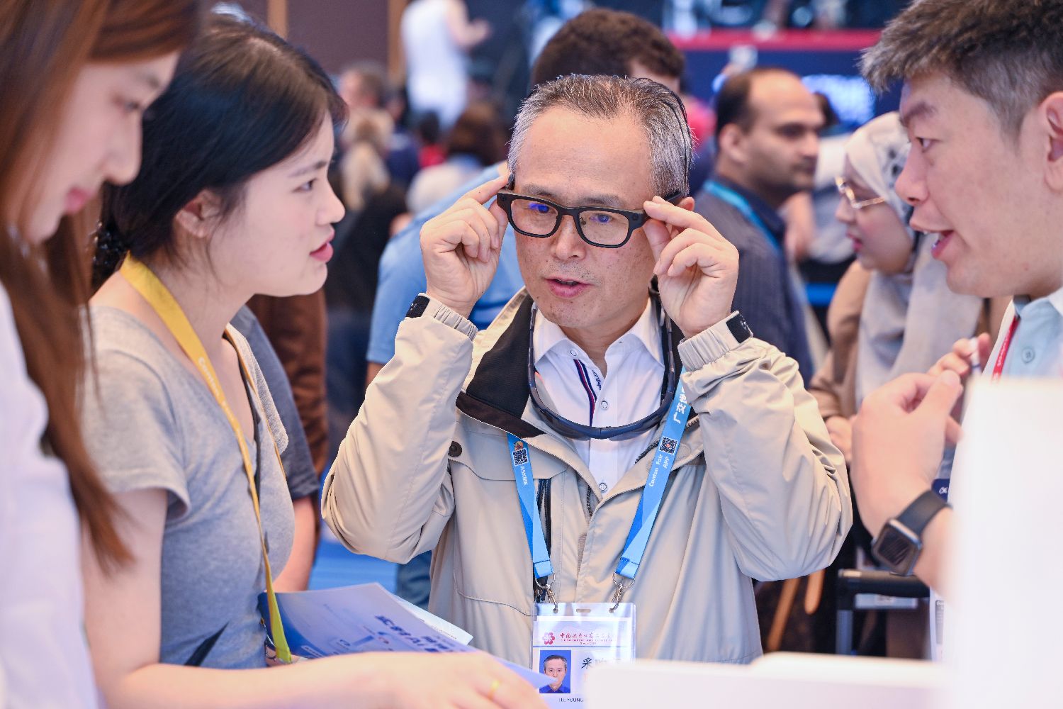 图为境外采购商体验一款AI翻译眼镜。(中新社)