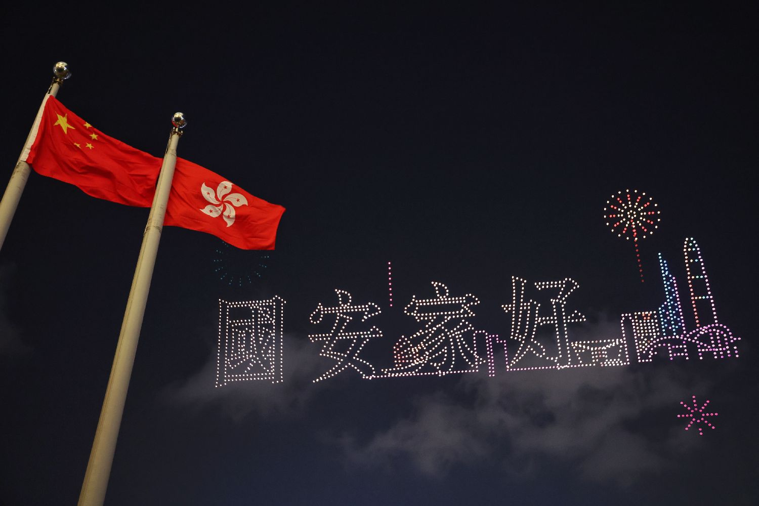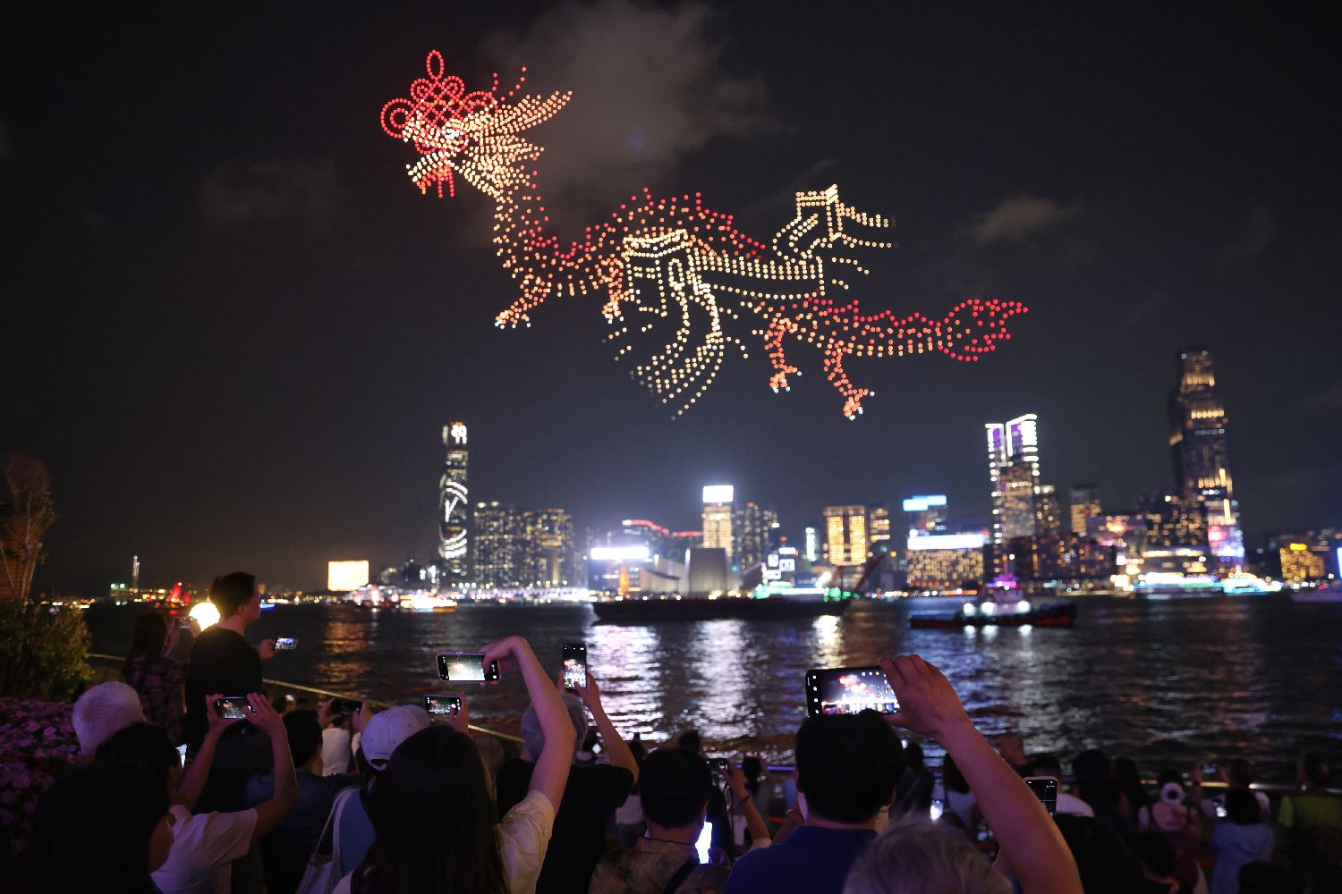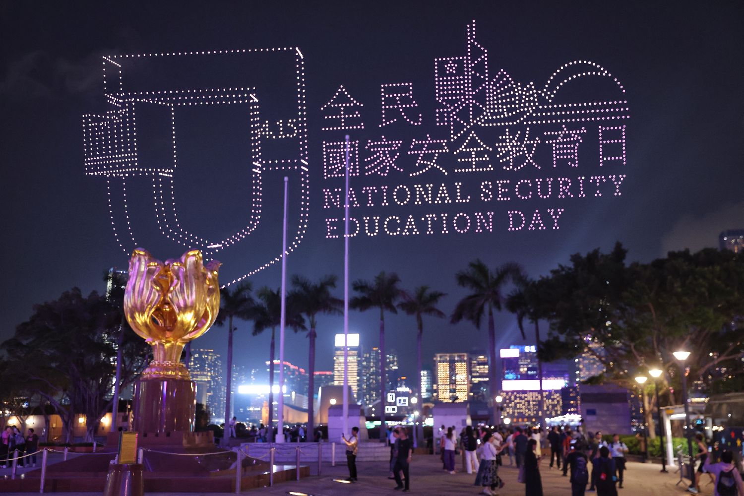 2026架无人机在维港腾空升起,以动感光影艺术演绎香港青年学生国家安全主题创意作品。