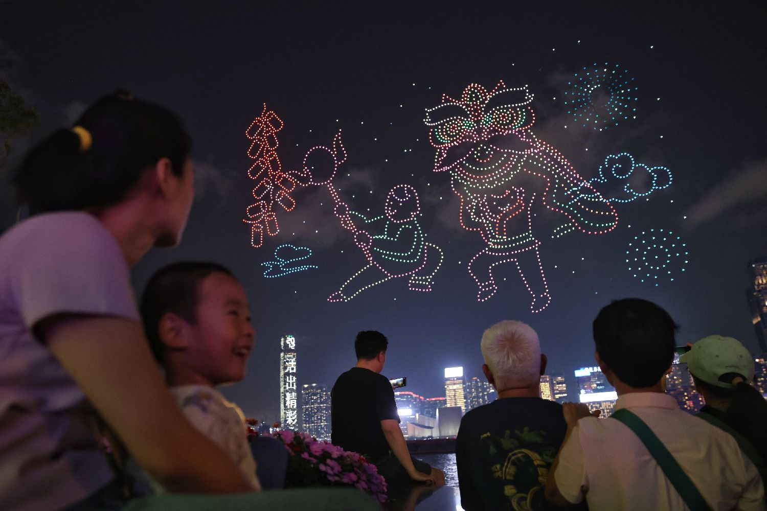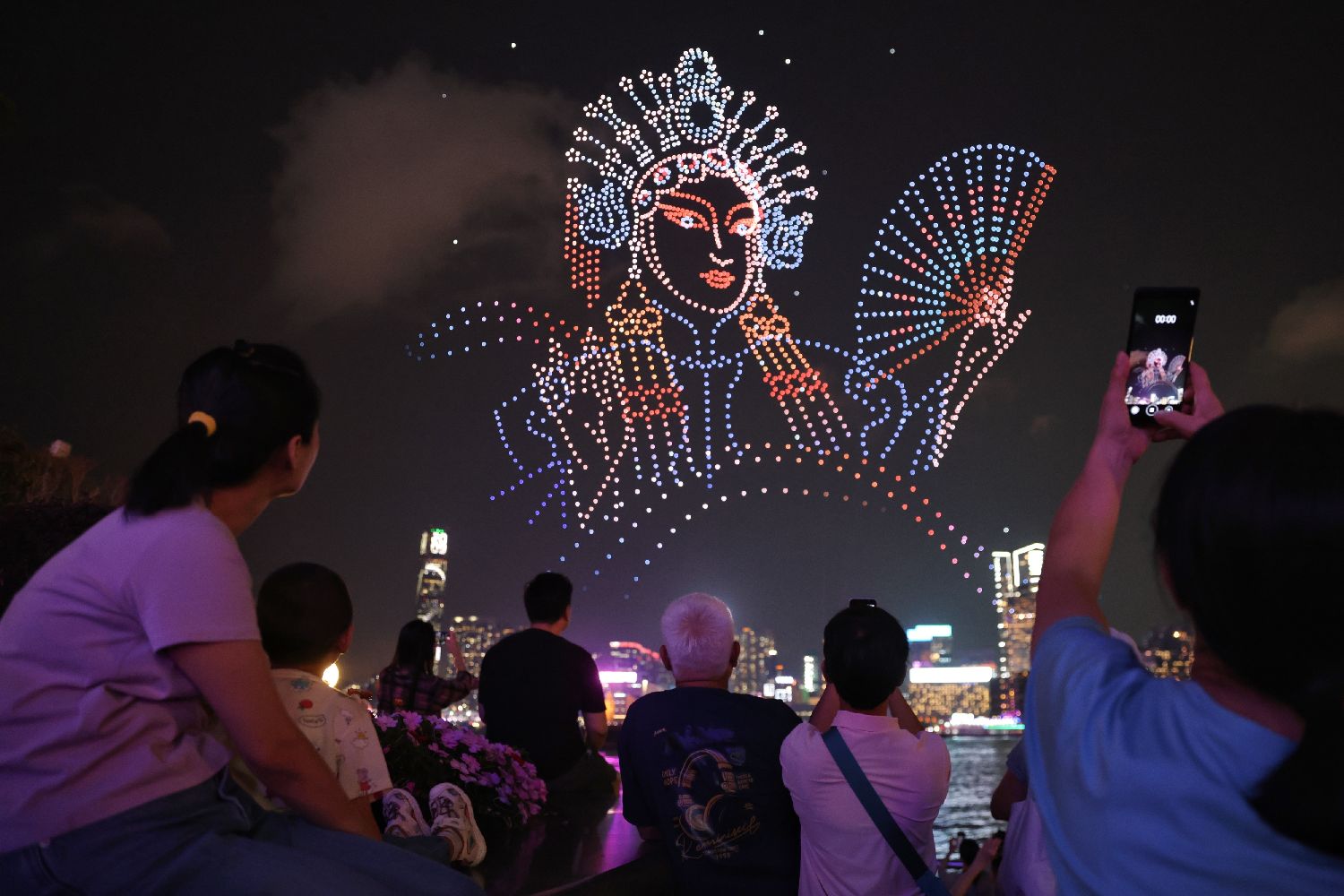 图为市民游客观看无人机表演。(香港中通社)