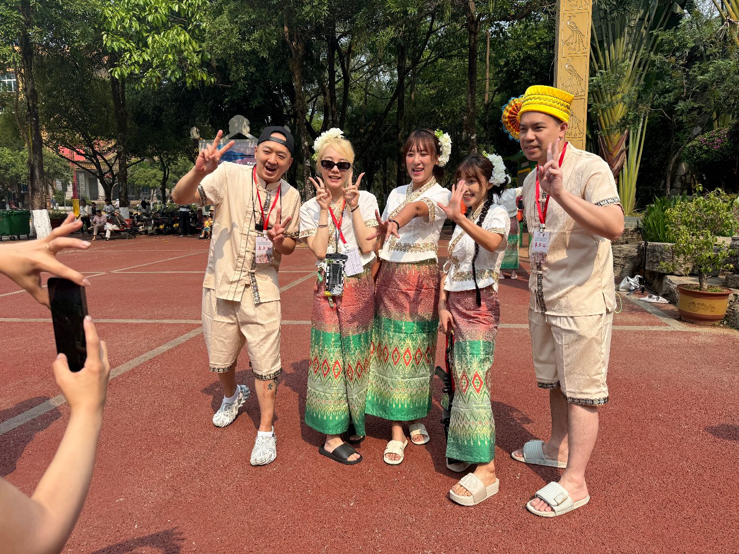 4月16日,台湾自媒体博主苏允恺(左一)与其他台青自媒体博主在云南省临沧市耿马县参加泼水节,并在活动现场合影留念。