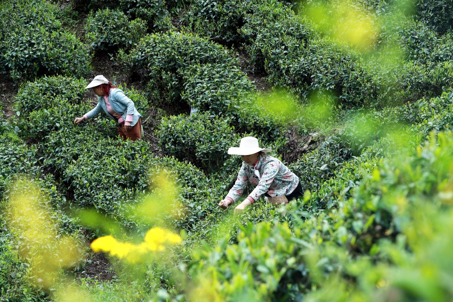 4月17日,湖北省宜昌市夷陵区太平溪镇,茶农在生态茶园里采摘“谷雨茶”。