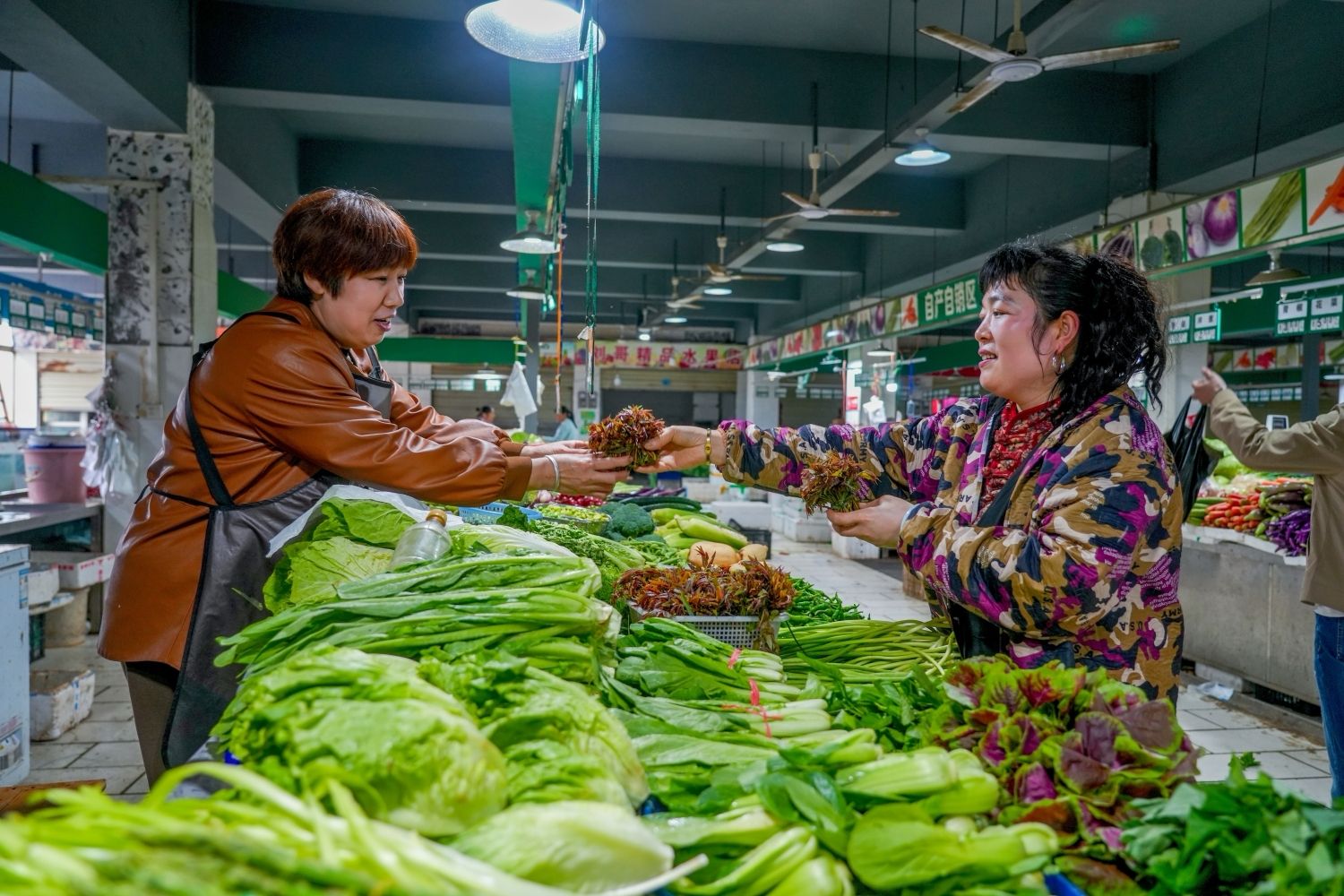 4月14日,湖北省宜昌市一菜市场内,市民正在购买香椿。