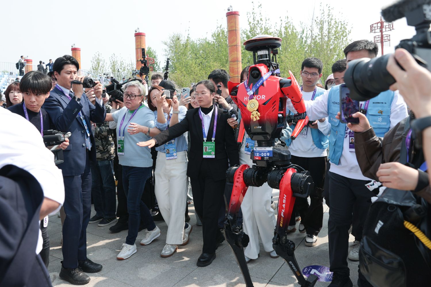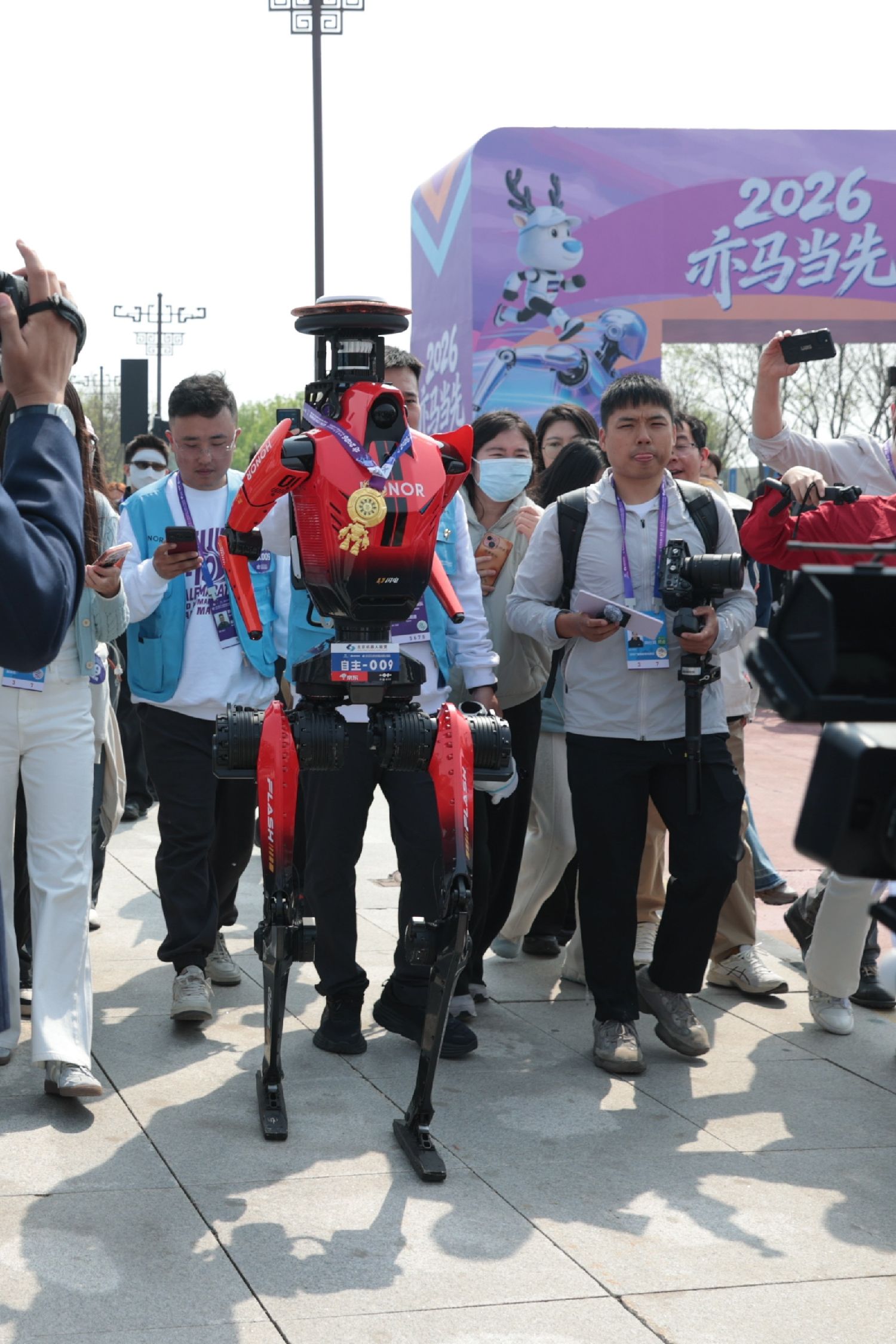 4月20日,备受瞩目的2026北京亦庄半程马拉松暨人形机器人半程马拉松鸣枪开跑。作为世界级人形机器人竞速盛宴,超百支机器人赛队与跑步爱好者一同冲出起跑线,穿梭于泡桐大道、文博大桥和南海子公园等地,在21.0975公里赛道上挑战极限。最终,一身亮眼红色战甲、来自齐天大圣队的“闪电”机器人以50分26秒的净用时,夺得赛事桂冠,成绩超越人类半程马拉松最快纪录。图为冠军团队准备接受媒体采访。(中新社)