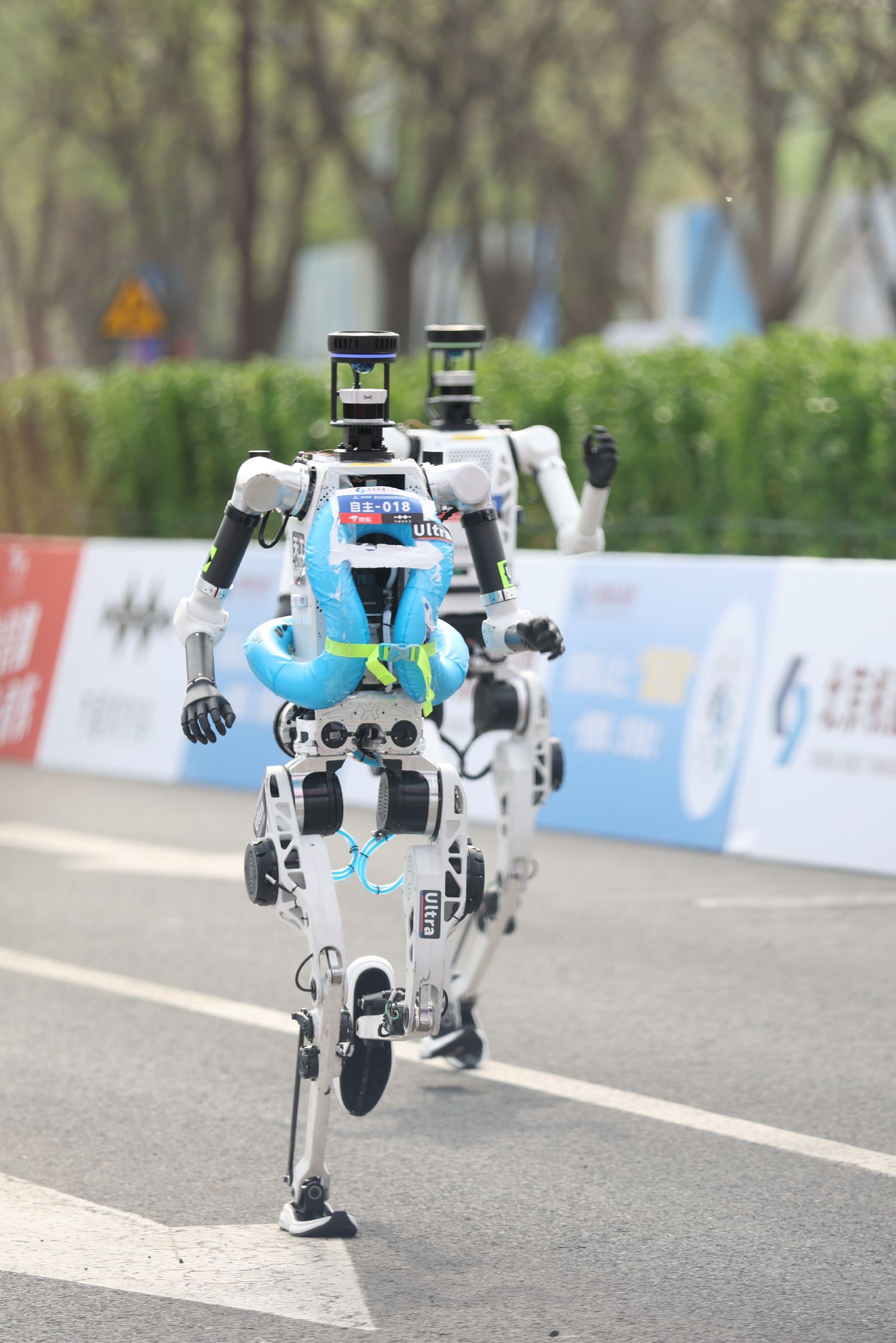 图为两名机器人争相冲向终点。(中新社)