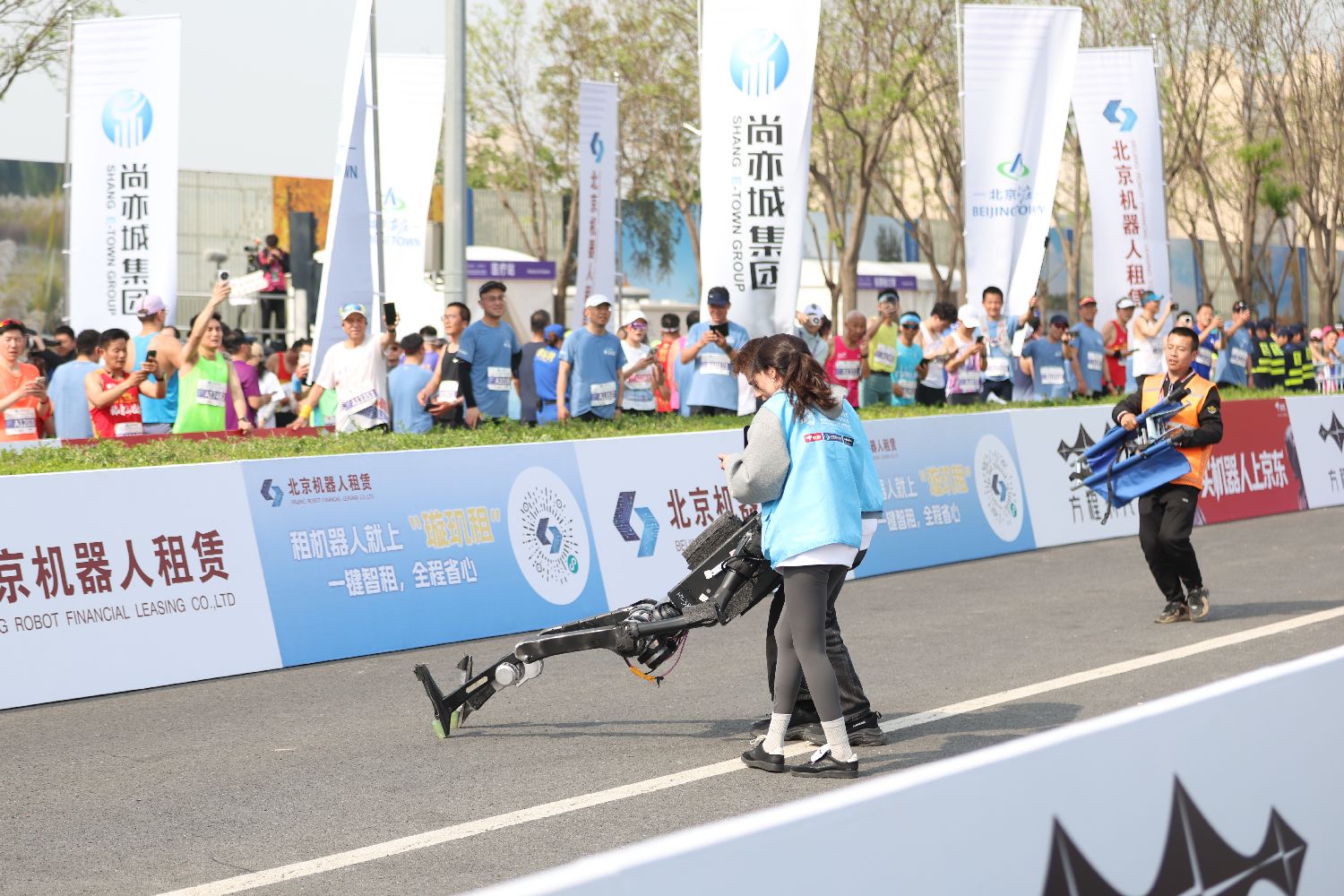 图为工作人员救助冲线后摔倒的机器人。(中新社)